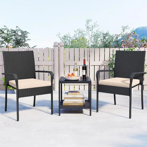 Upgrade your outdoor living area with this stylish and comfortable 3-Piece Outdoor Rattan Bistro Set — perfect for patios, gardens, balconies, poolside corners, courtyards, and porch spaces. This compact yet functional set includes two cushioned rattan chairs plus a tempered glass-top table, making it ideal for relaxing with morning coffee, afternoon chats, or sunset cocktails.